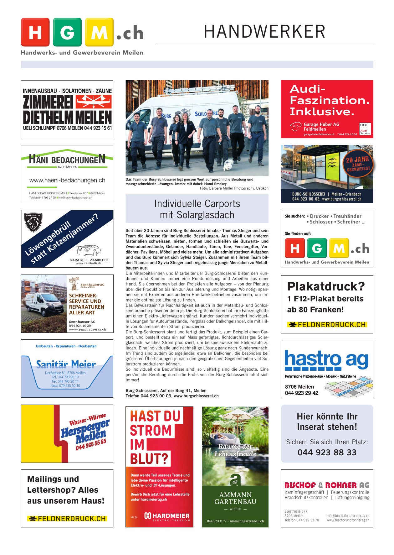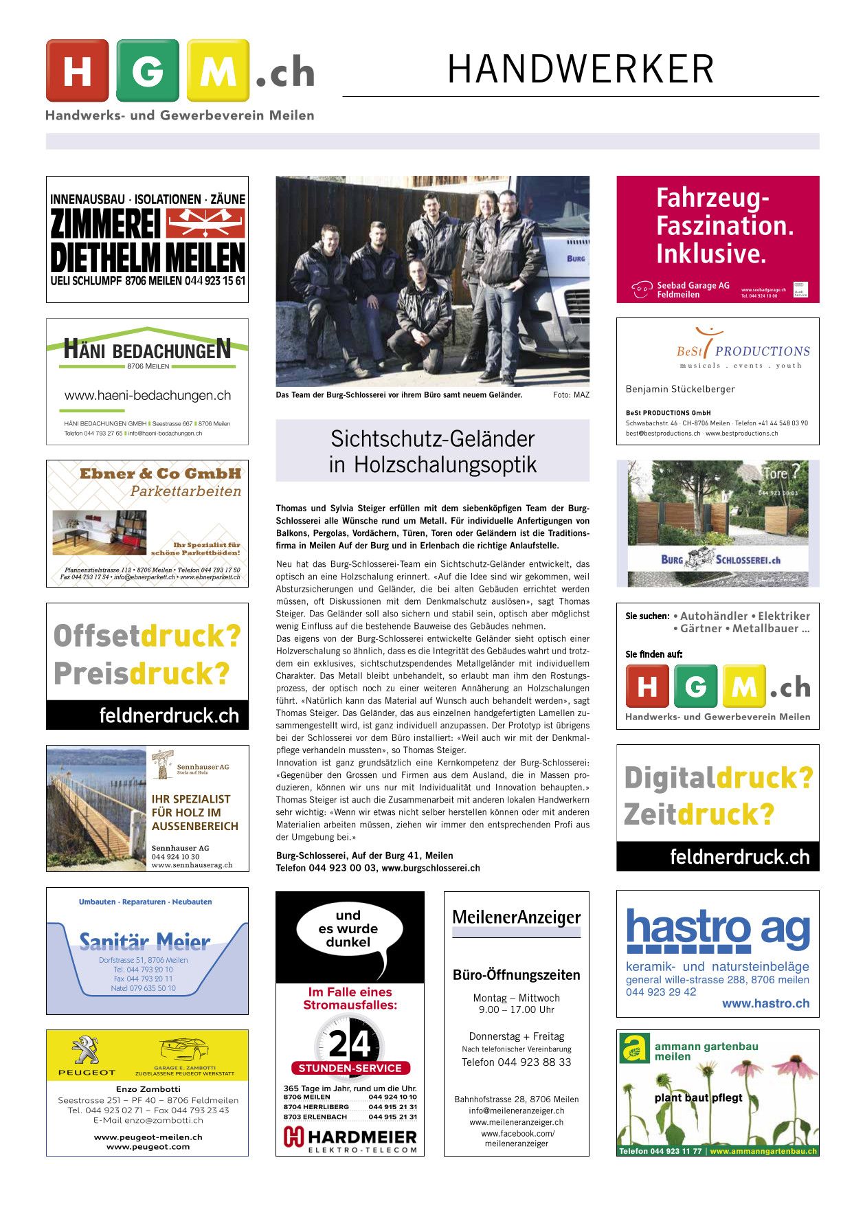 Die Burg-Schlosserei, gegründet 2001 von Thomas Steiger und seiner Partnerin Sylvia Jud, hat 8 Mitarbeiter, darunter 2 Lernende, und ist stolz auf professionelle Arbeit mit viel Liebe zum Detail. Zum Stammbetrieb auf der Burg ob Meilen ist vor einiger Zeit eine zweite Werkstatt in Erlenbach gekommen. «Top of Meilen – Lakeside Erlenbach» lautet deshalb der Werbeslogan der Burg-Schlosserei.