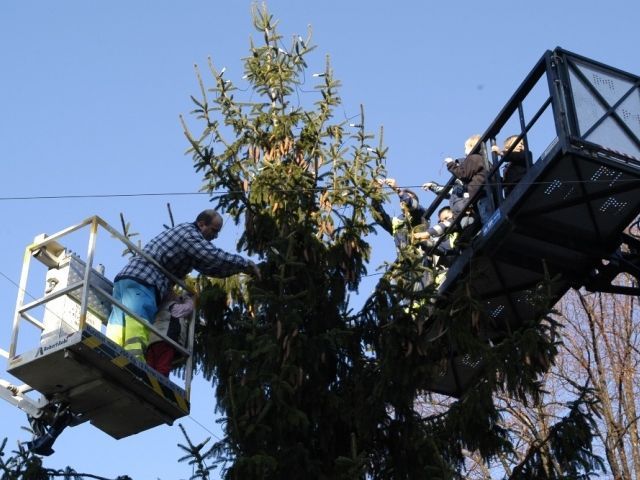 Besucher dürfen mit Hilfe des Burg-Schlosserei Teams Kugeln verzieren und mit der Hebebühne am grossen Baum auf dem neuen Dorpflatz aufhängen.