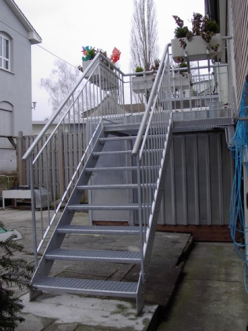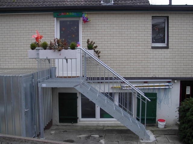 Gitterrost-Treppe mit Podest und Geräteschuppen
